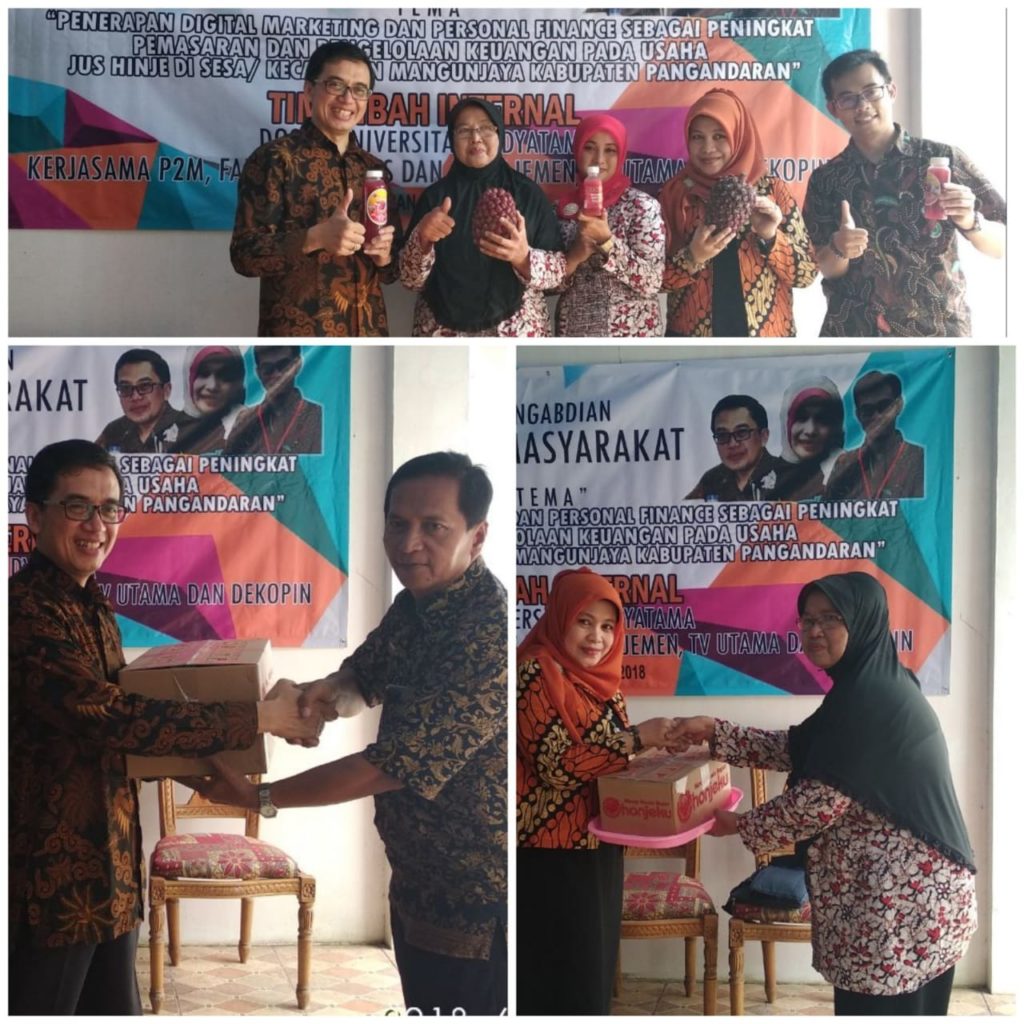 Hibah internal yang diberikan oleh Lembaga Penelitian Dan Pengabdian Pada Masyarakat (LP2M) Universitas Widyatama kepada Tim Dosen Fakultas Bisnis Manajemen Keni Kaniawati SE.Msi sebagai Ketua PKM dan Andhi Sukma S.Si.SE.MM. sebagai Anggota. Kegiatan PKM yang dilaksanakan pada tanggal 27 juni – 29 Juni 2018 Tim Hibah Internal bekerjasama dengan P2M Utama, dan Dekopin yang diwakili oleh Ketua Harian Dr.Agung Sudjatmoko yang mempunyai kepakaran pada bidang UMKM dan Koperasi, Biro Marketing Utama dan Biro Fasilitas Utama melaksanakan PKM kepada UKM jus honje di Desa/Kecamatan Mangunjaya Kabupaten Pangandaran. Kegiatan PKM yang dihadiri oleh Bapak Karli sebagai Kasi. Pemerdayaan dan Perlindungan Koperasi Kabupaten Pangandaran, perangkat kelurahan dan kecamatan beserta jajaranya serta 53 anggota Koperasi Serba Usaha (KSU) Kuntum Mekar, berjalan dengn baik dan menghasilkan pengembangan wawasan pelku usaha untuk lebih mengembangkan usahanya.